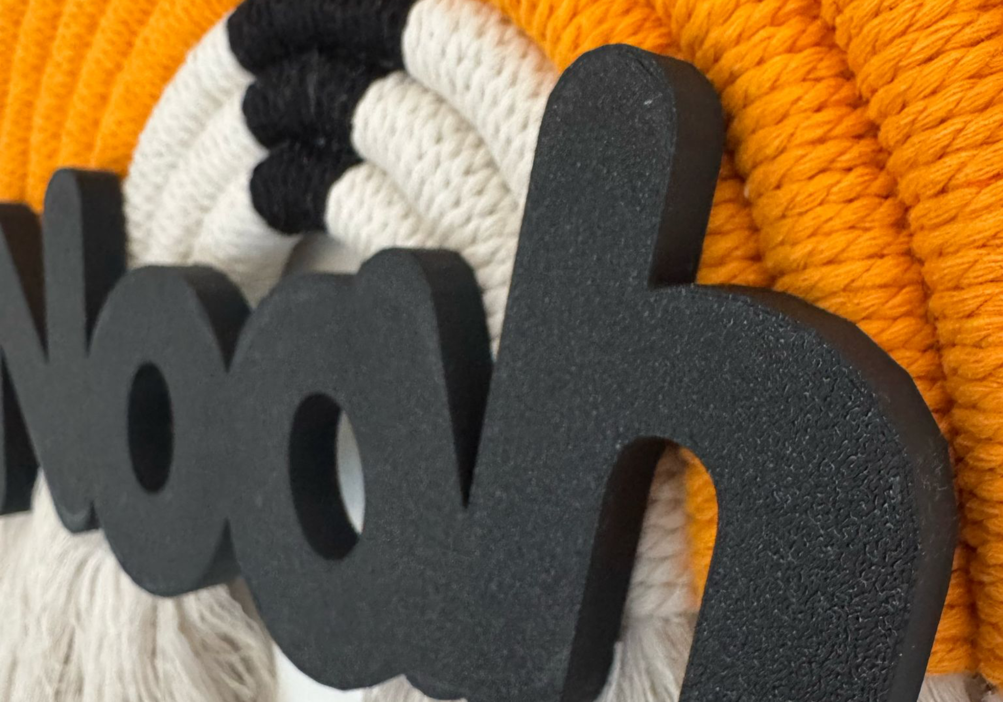 Auf Wunsch drucken wir den Namen eures Kindes in schwarzer Schrift mit unserem 3D-Drucker und befestigen ihn auf dem Makramee.